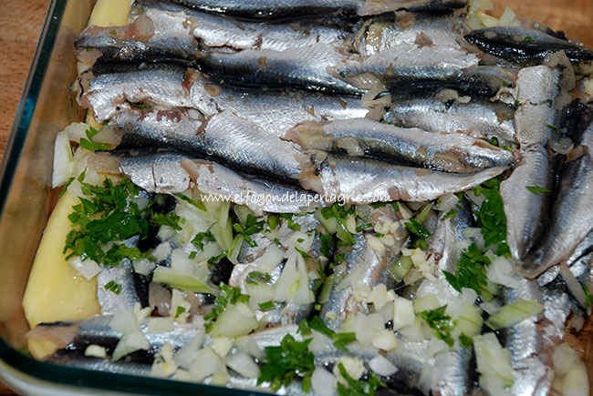 En una fuente de cristal para horno, ponemos las patatas peladas y cortadas muy finas para que se pongan blandas en poco tiempo. Encima vamos a poner una capa de boquerones y sobre esta capa, los ajos y el perejil picado.
