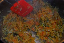 Una vez listo el refrito, añadimos los fideos. Mezclamos y añadiremos el agua de hervir la cabeza y las espinas de la caballa pasada por un colador para evitar que caigan impurezas.