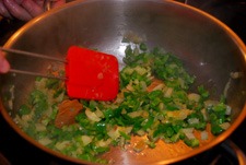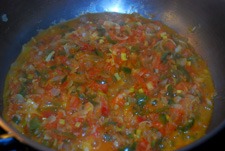 En una olla vamos a hacer el refrito con un fondo de aceite al que vamos a añadir los ajos fileteados, la cebolla y los pimientos picados. Cuando están listos, añadiremos el tomate pelado y cortado a dados pequeños. Salpimentamos y dejamos que se haga bien el tomate.