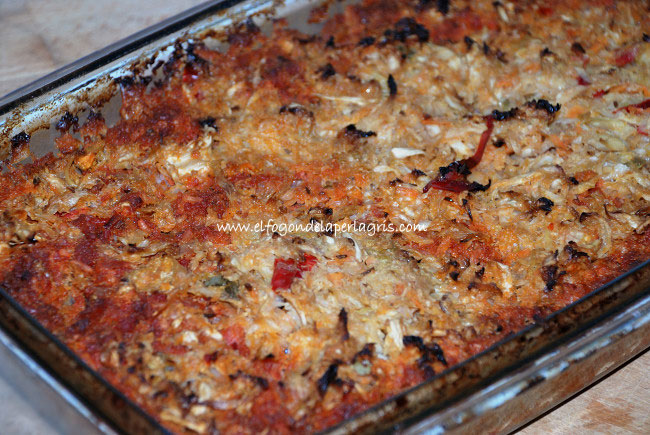 Calentamos el horno a fuego medio y metemos la bandeja y dejamos que se gratine por encima las coles. Sacamos la bandeja y esperamos que se enfríe un poco antes de cortarla en porciones.