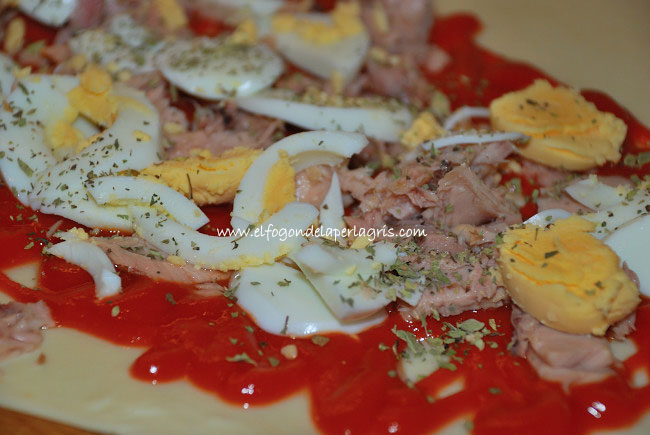 Desplegamos una de las láminas de hojaldre fresco y ponemos un poco de tomate frito, encima del tomate el atún enlatado escurrido, un poco de sal y los huevos duros troceado que teníamos cocidos con anterioridad.