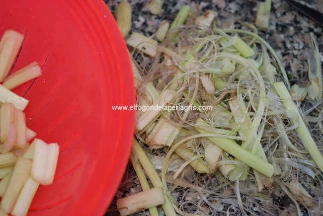 Estos tallos son muy fibrosos y hay que limpiarlos, el proceso es igual que al limpiar el apio. Con un cuchillo pequeño o puntilla, tenemos que ir tirando de los hilos de fibra.