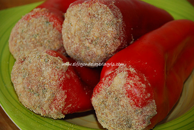 Una vez está la mezcla homogénea la introducimos con ayuda de una cucharilla dentro de los pimientos. Cuando todos los pimientos están rellenos, pasamos el exterior de la carne en un poco de pan rallado. De esa forma sellamos los pimientos y crearemos una capa crujiente al freírlos.