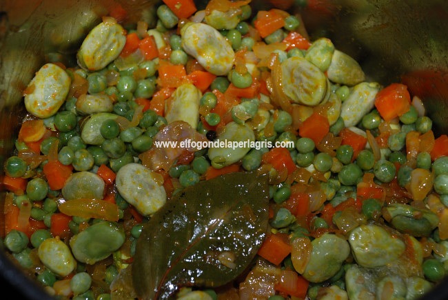 Agregamos el bacon, una hoja de laurel y los guisantes. Aquí le añadí yo también habas frescas, pero es opcional. Removemos un poco y echamos un cuarto de vaso de vino blanco de jerez.